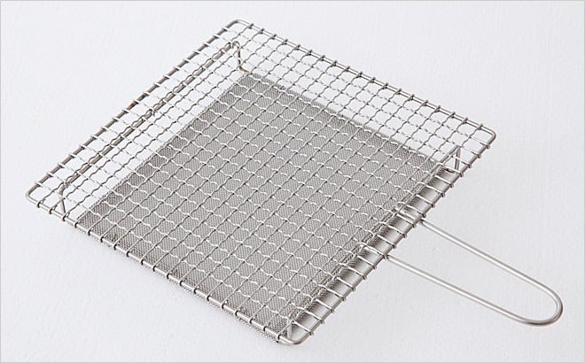 持ち手付きで五徳に置くだけでフライパンのように手軽にお使いいただけます。大サイズは洗いやすいように焼網部分が上に開きます。